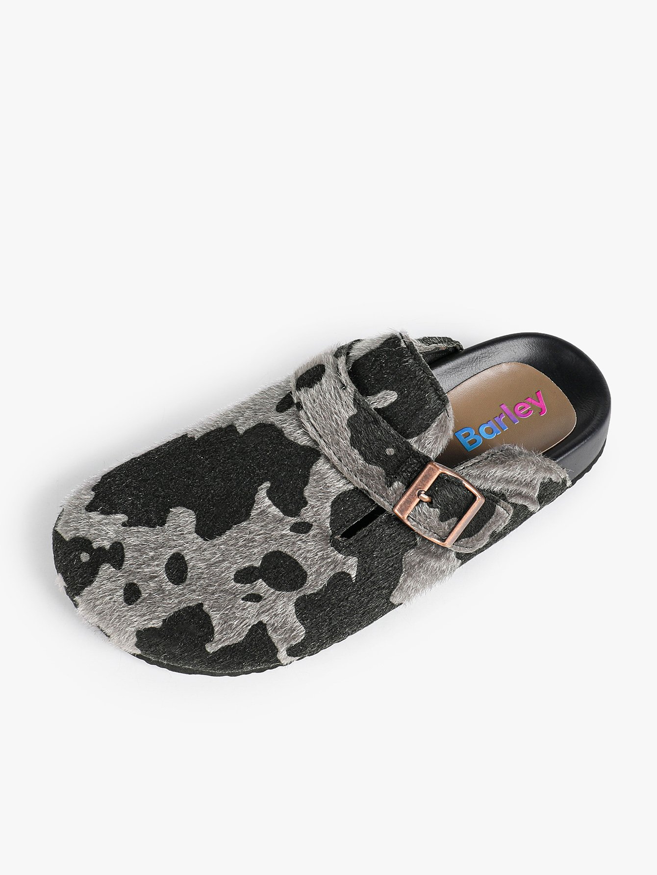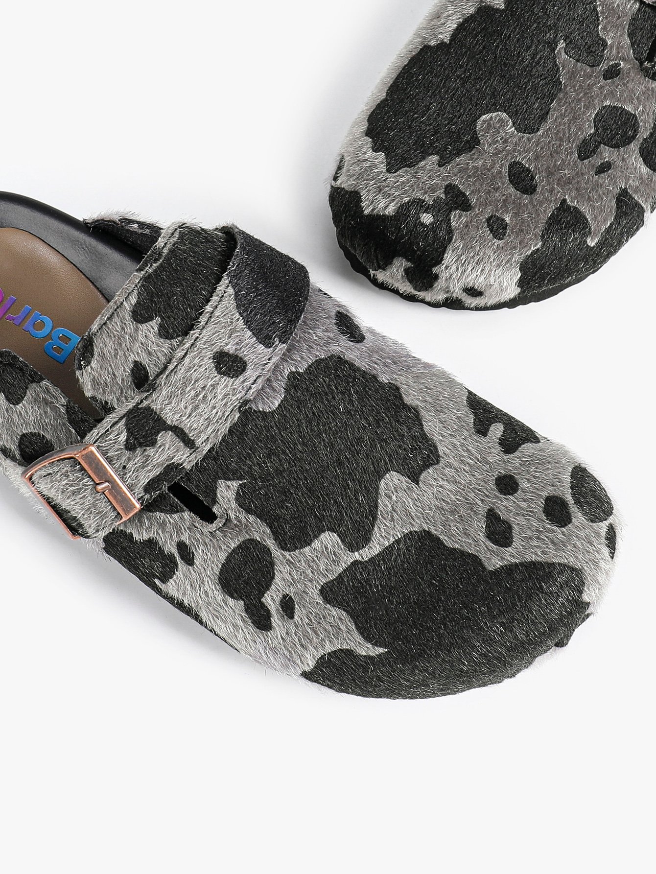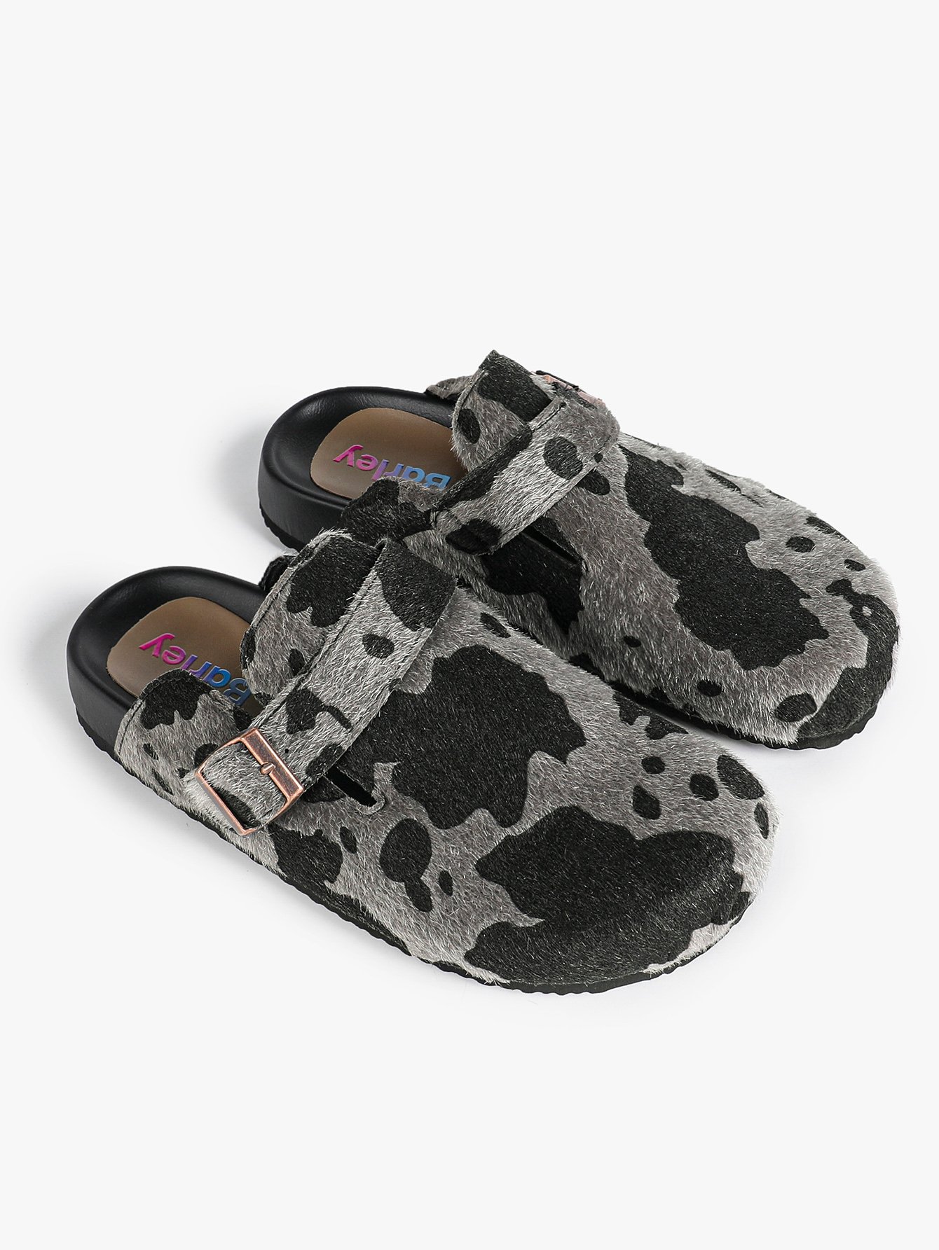 Birkenstocks, black and grey striped pattern, casual and comfortable.