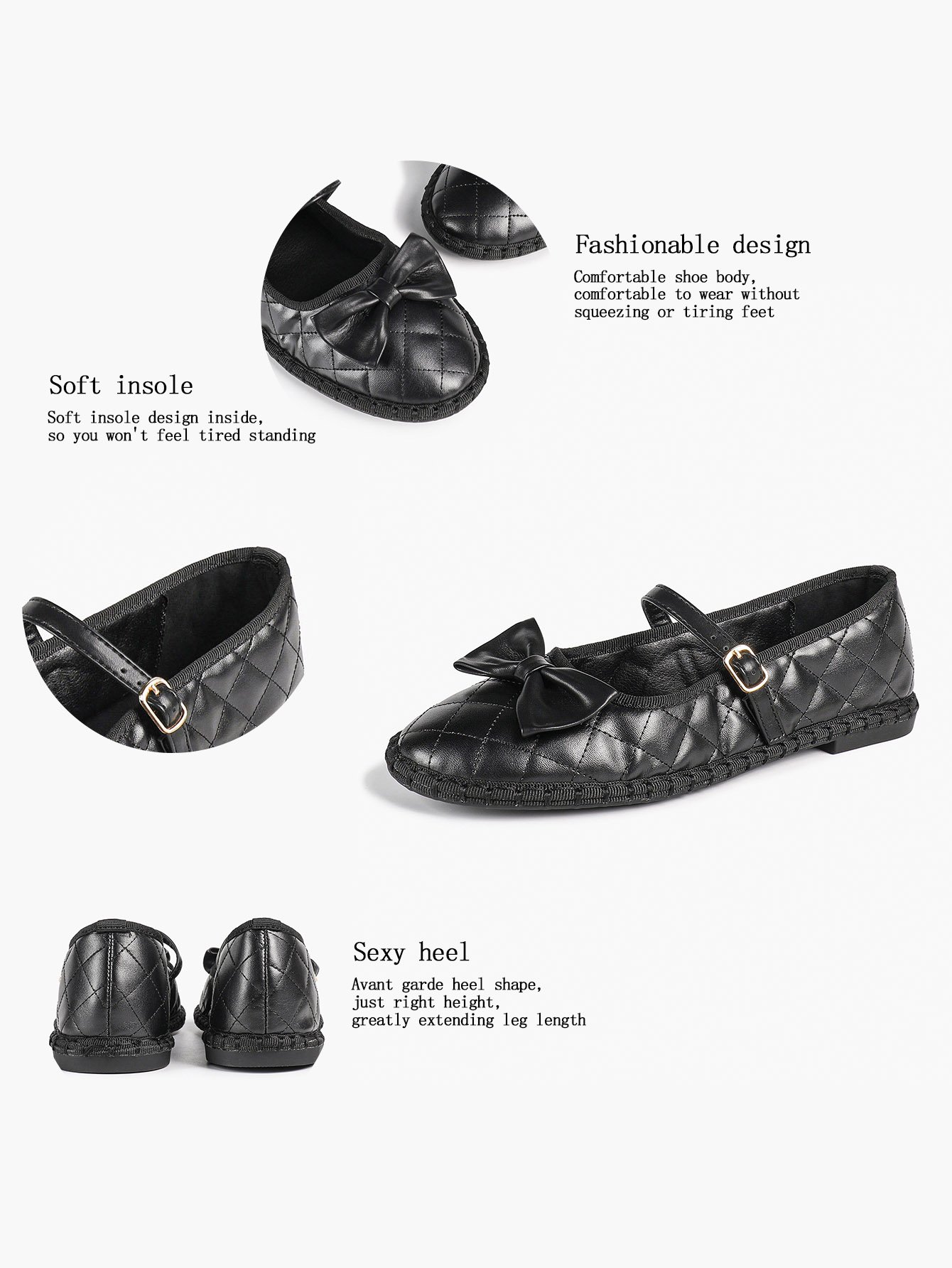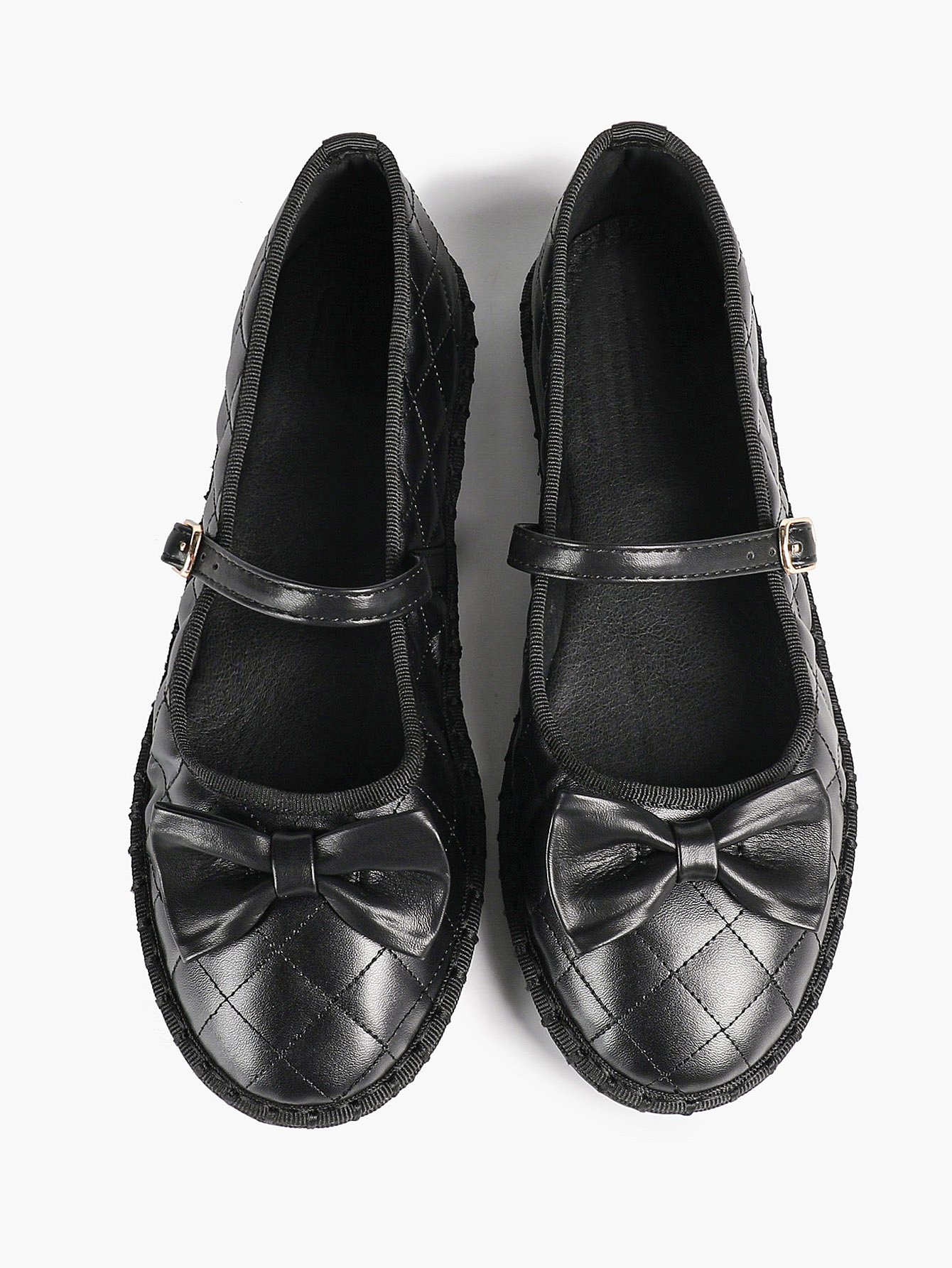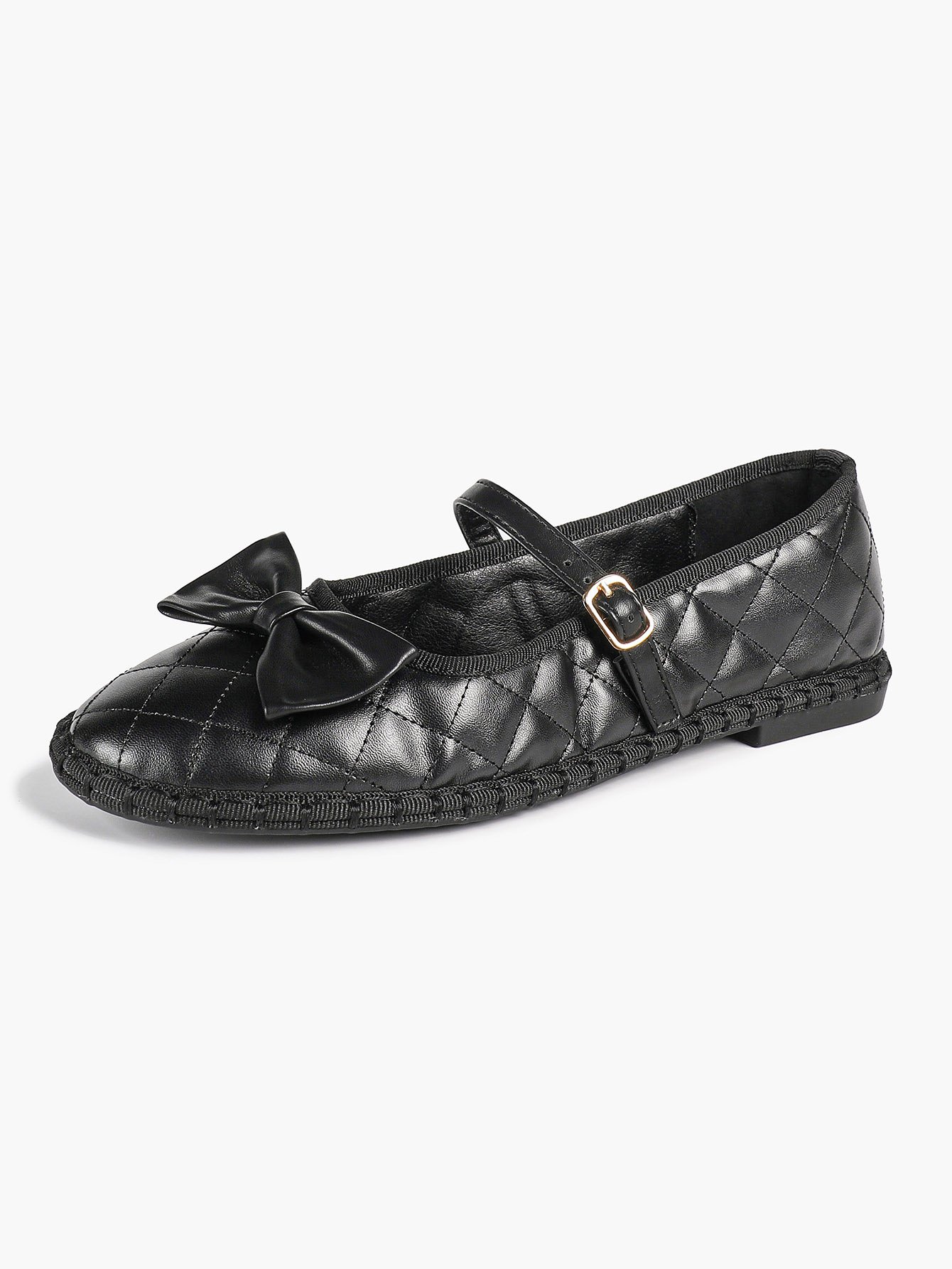 Black Quilted Leather Bow Mary Jane Pointed Toe Flats | Daily Wear, Date Night Shoes
