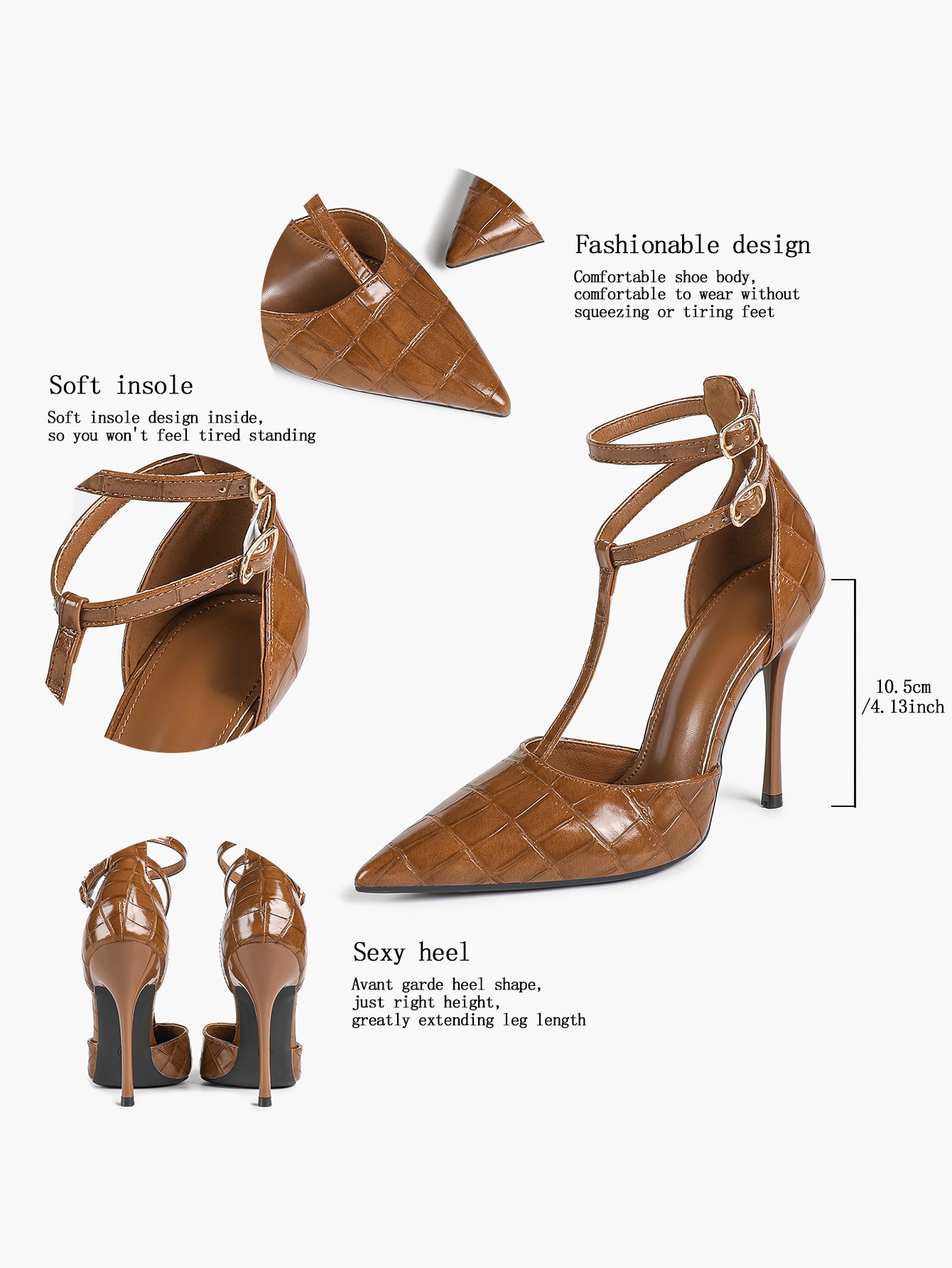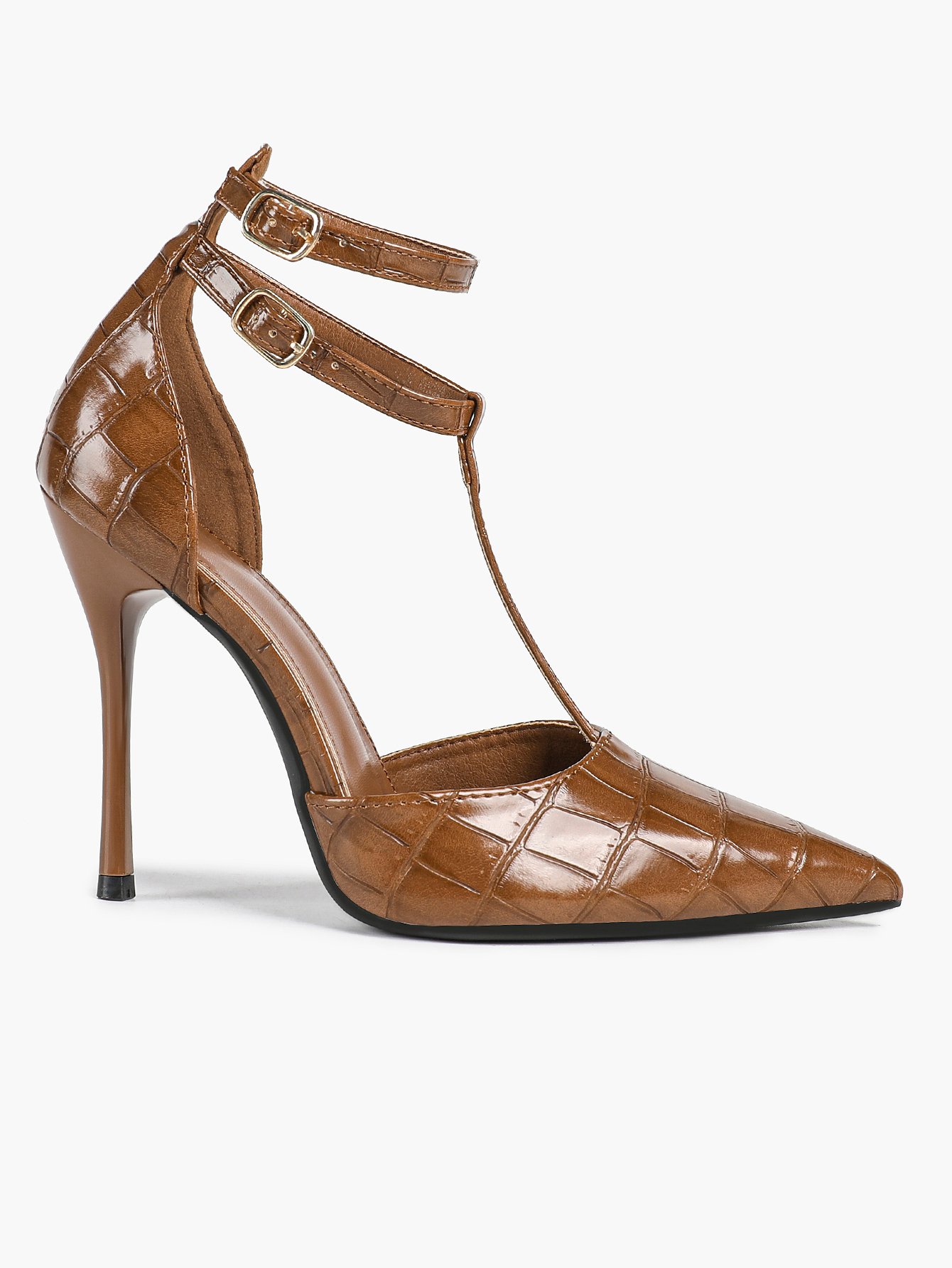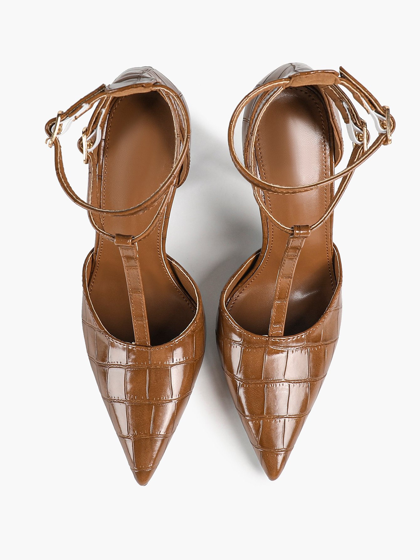 Brown Croc-Embossed T-Strap Pointed Toe Stiletto Heels | Date Night, Party, Evening Heels
