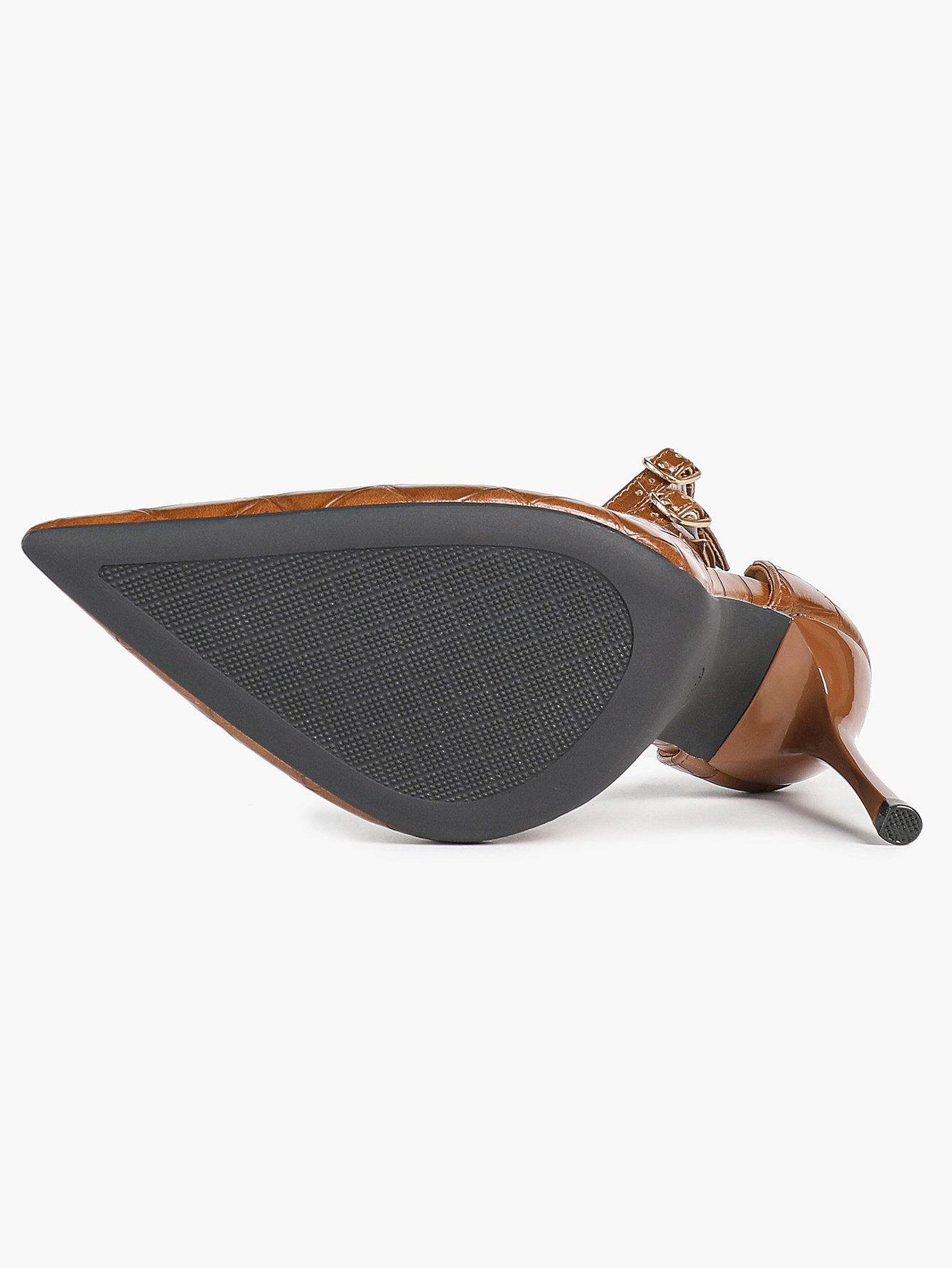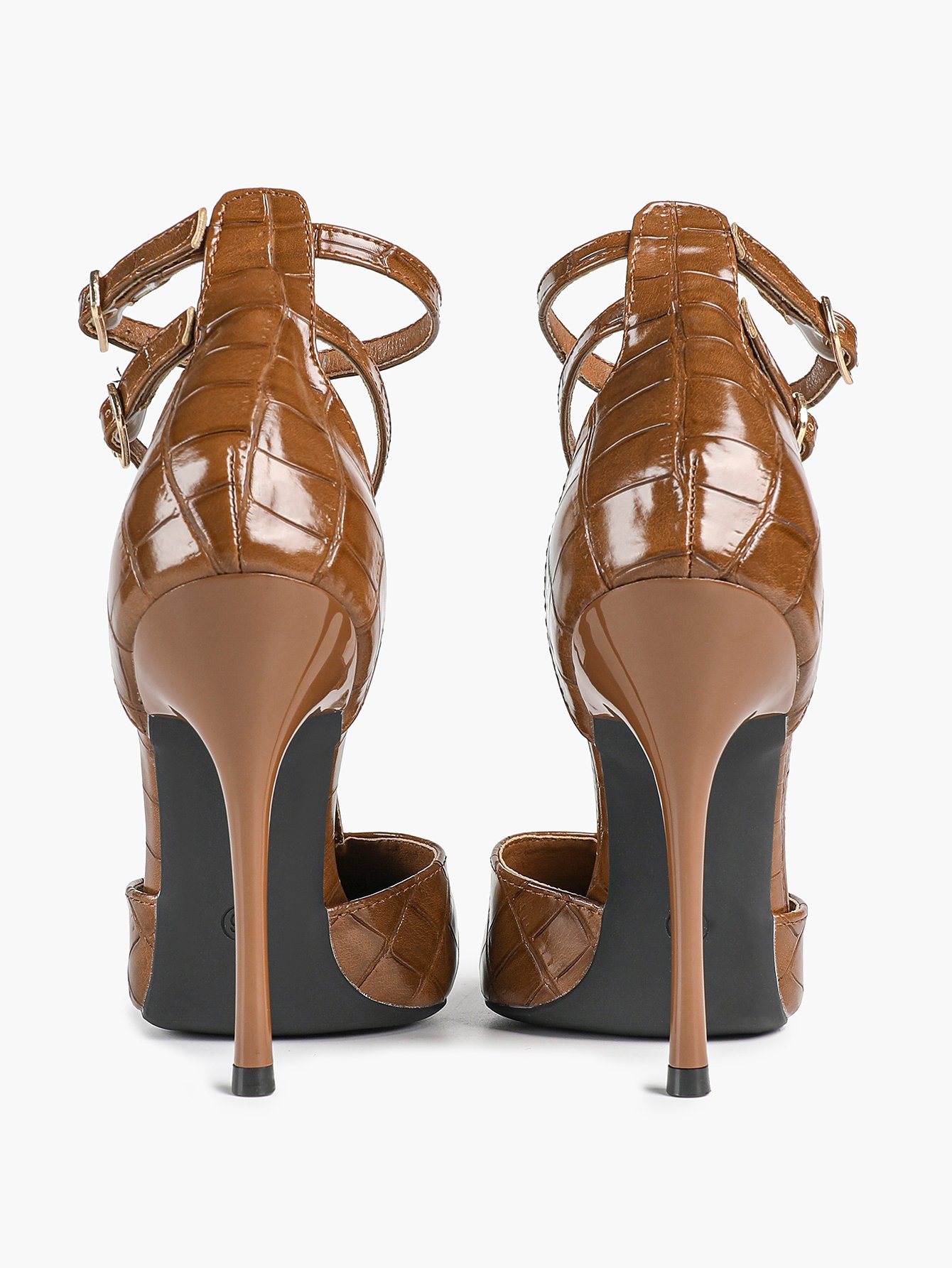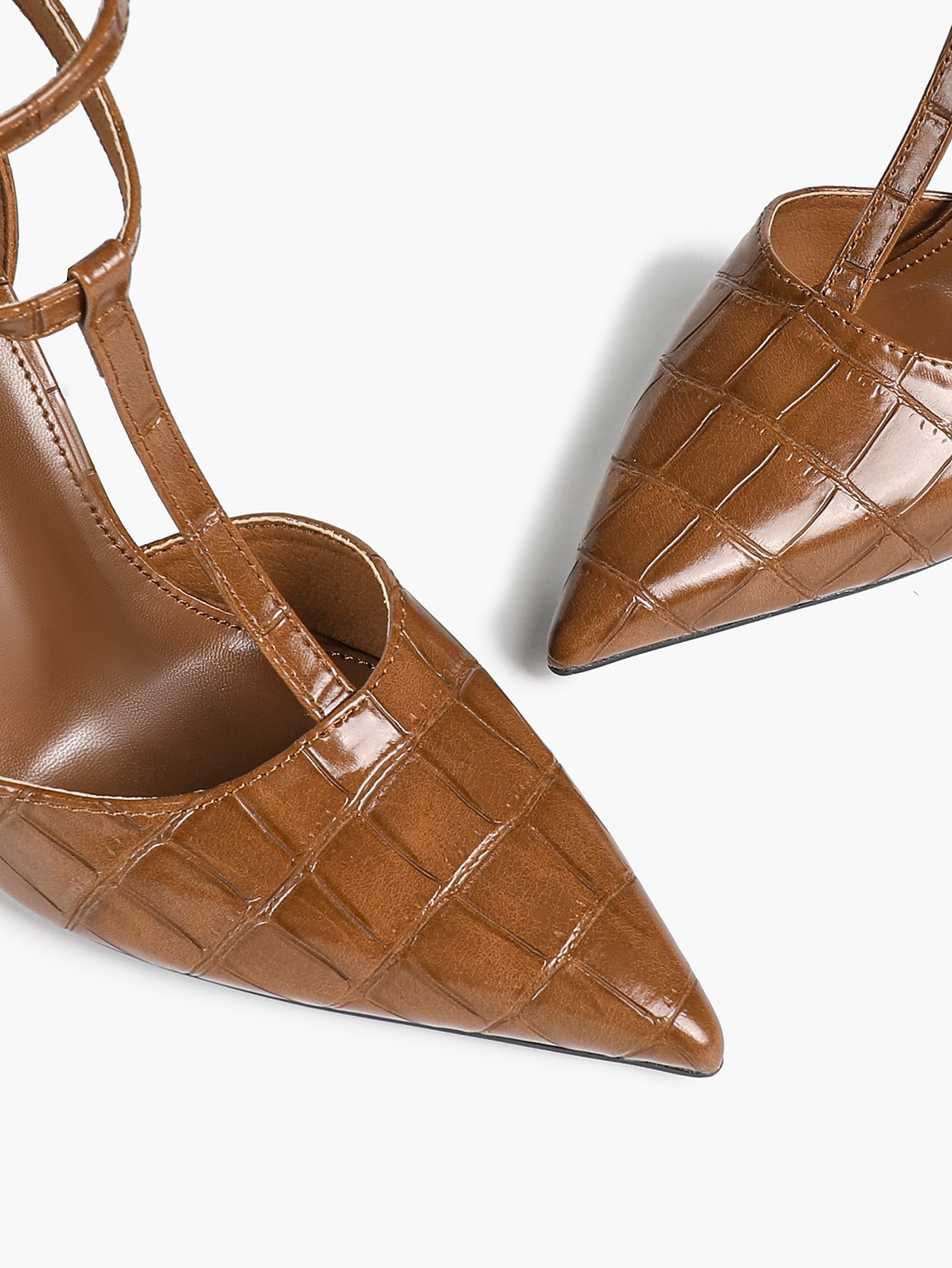 Brown Croc-Embossed T-Strap Pointed Toe Stiletto Heels | Date Night, Party, Evening Heels