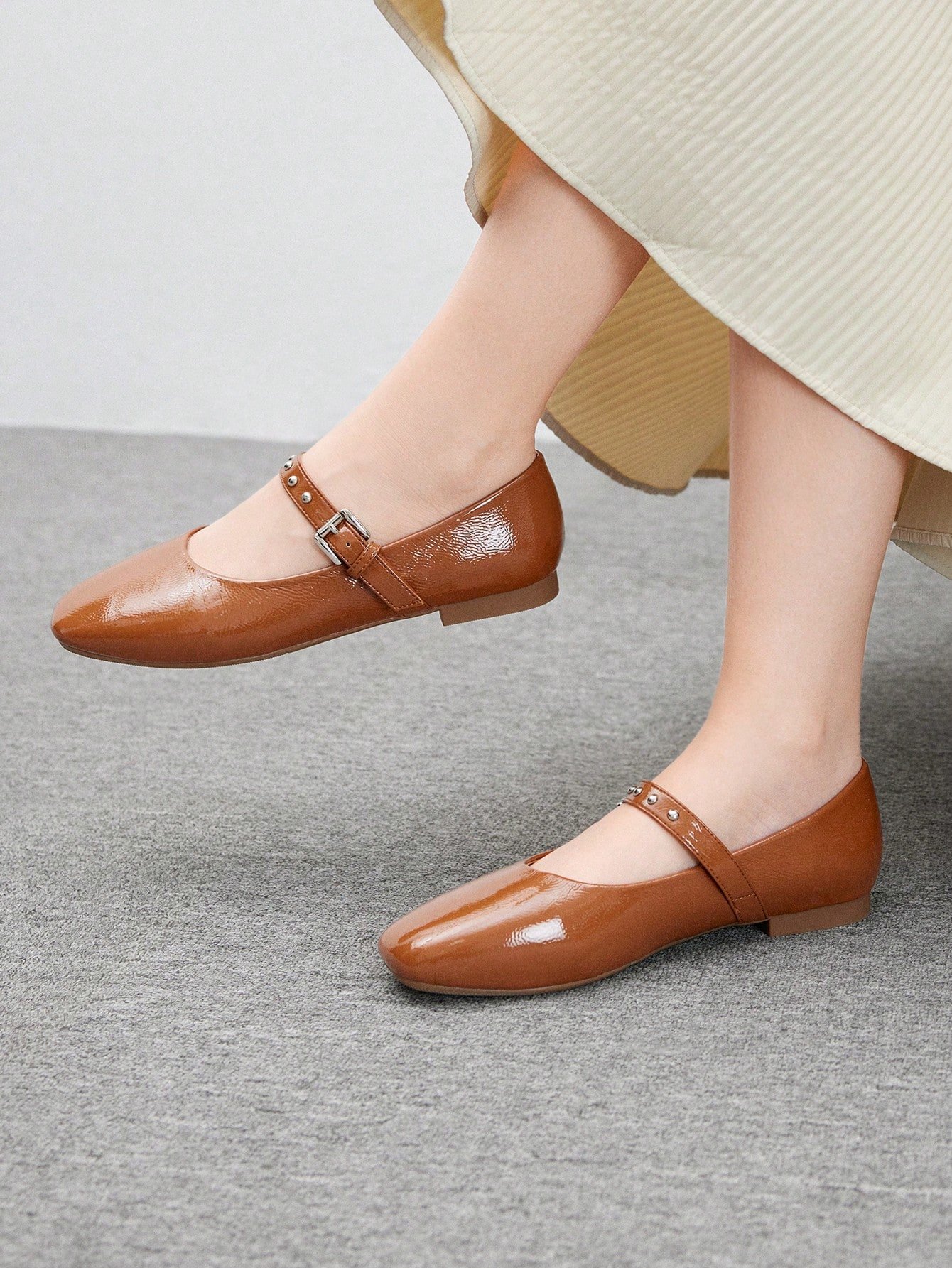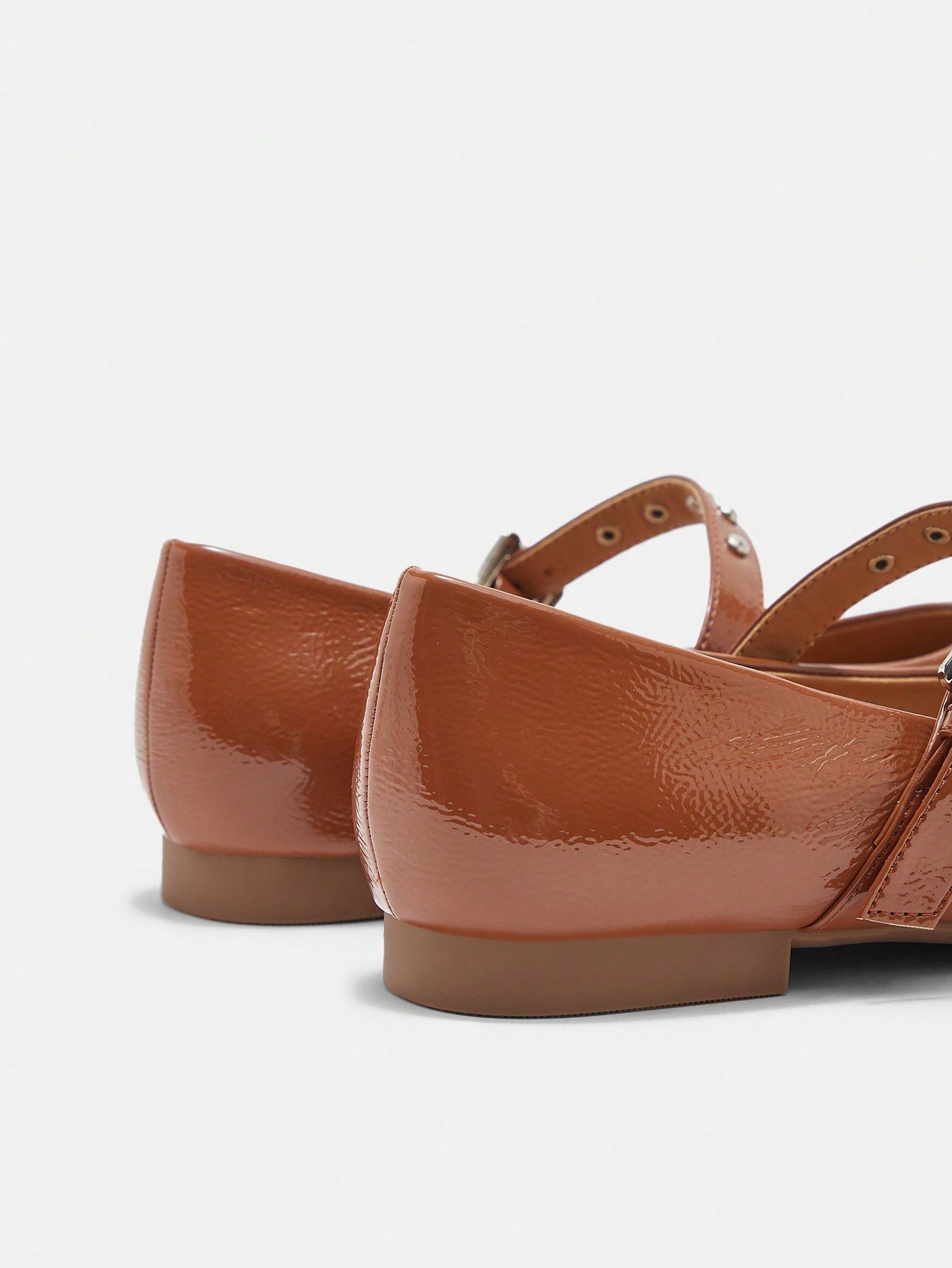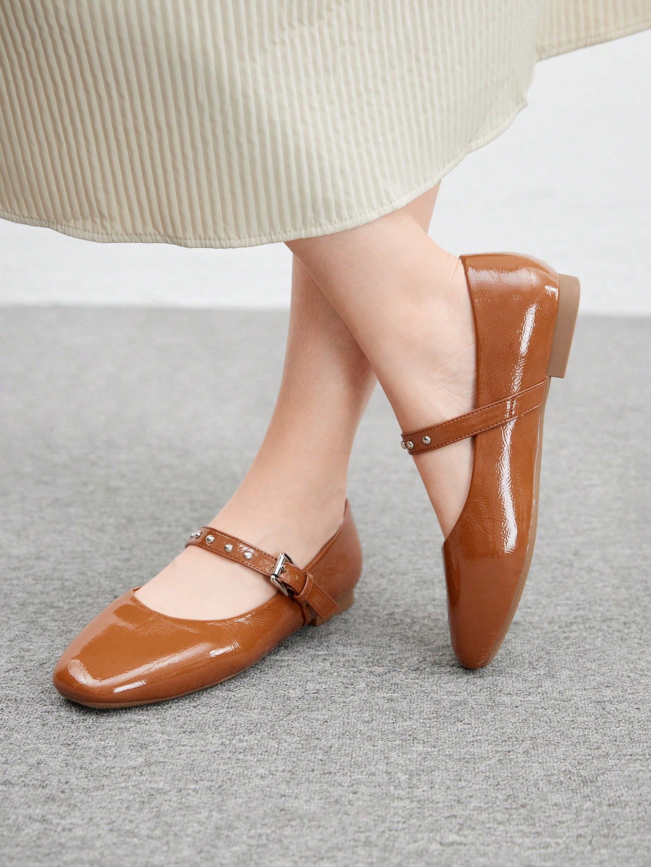 A fusion of retro and modern, these shoes perfectly blend the girly feel of a Mary Jane with the cool texture of metal rivets and a glossy finish