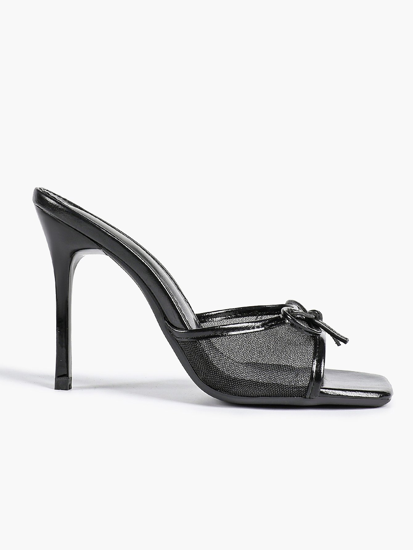 Elevate your look with these Mesh Bow Square Toe Stiletto Mules.