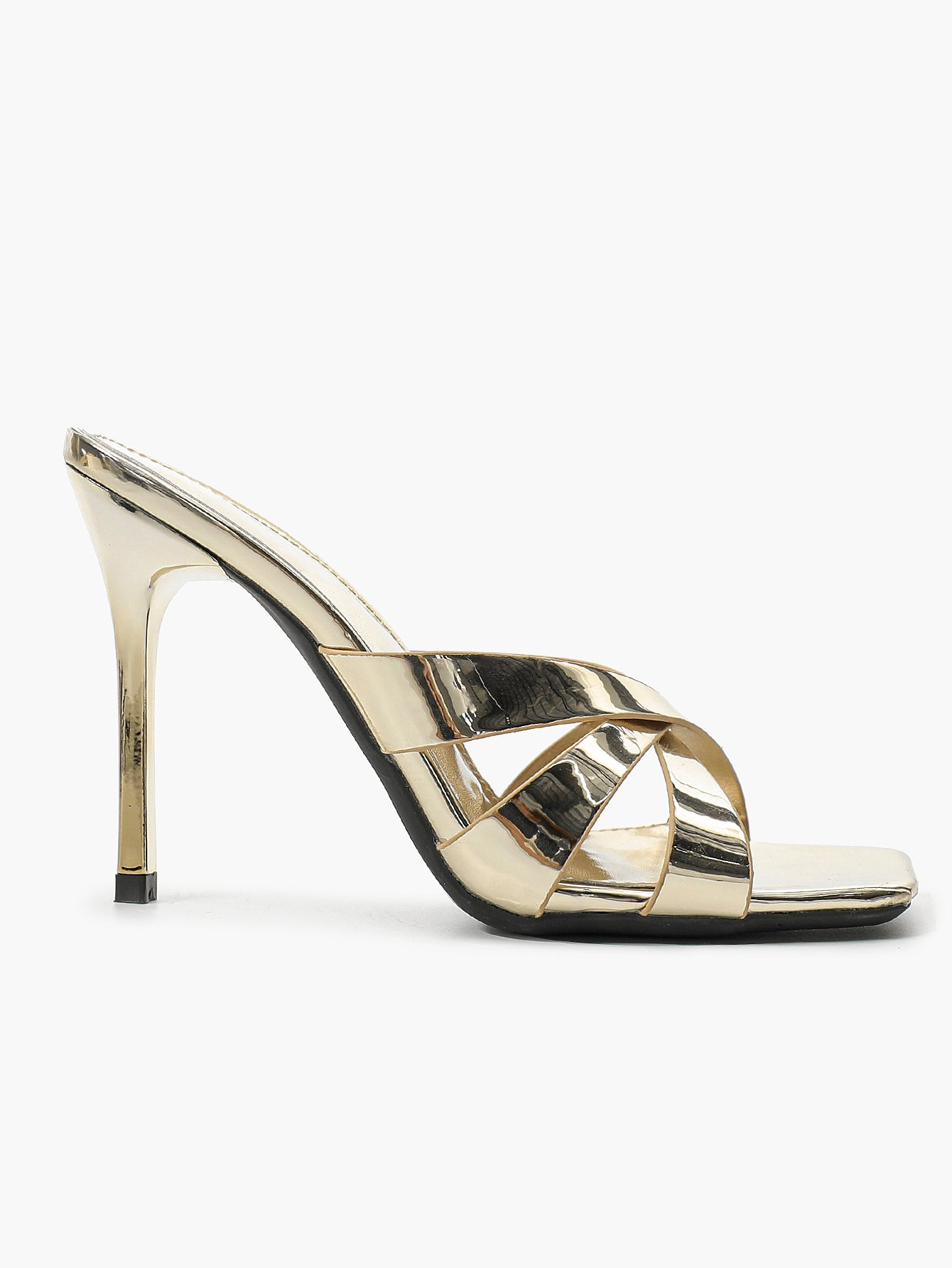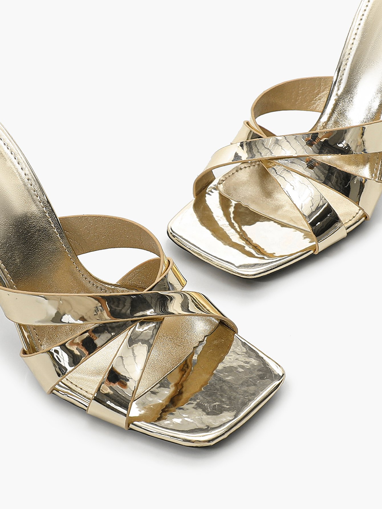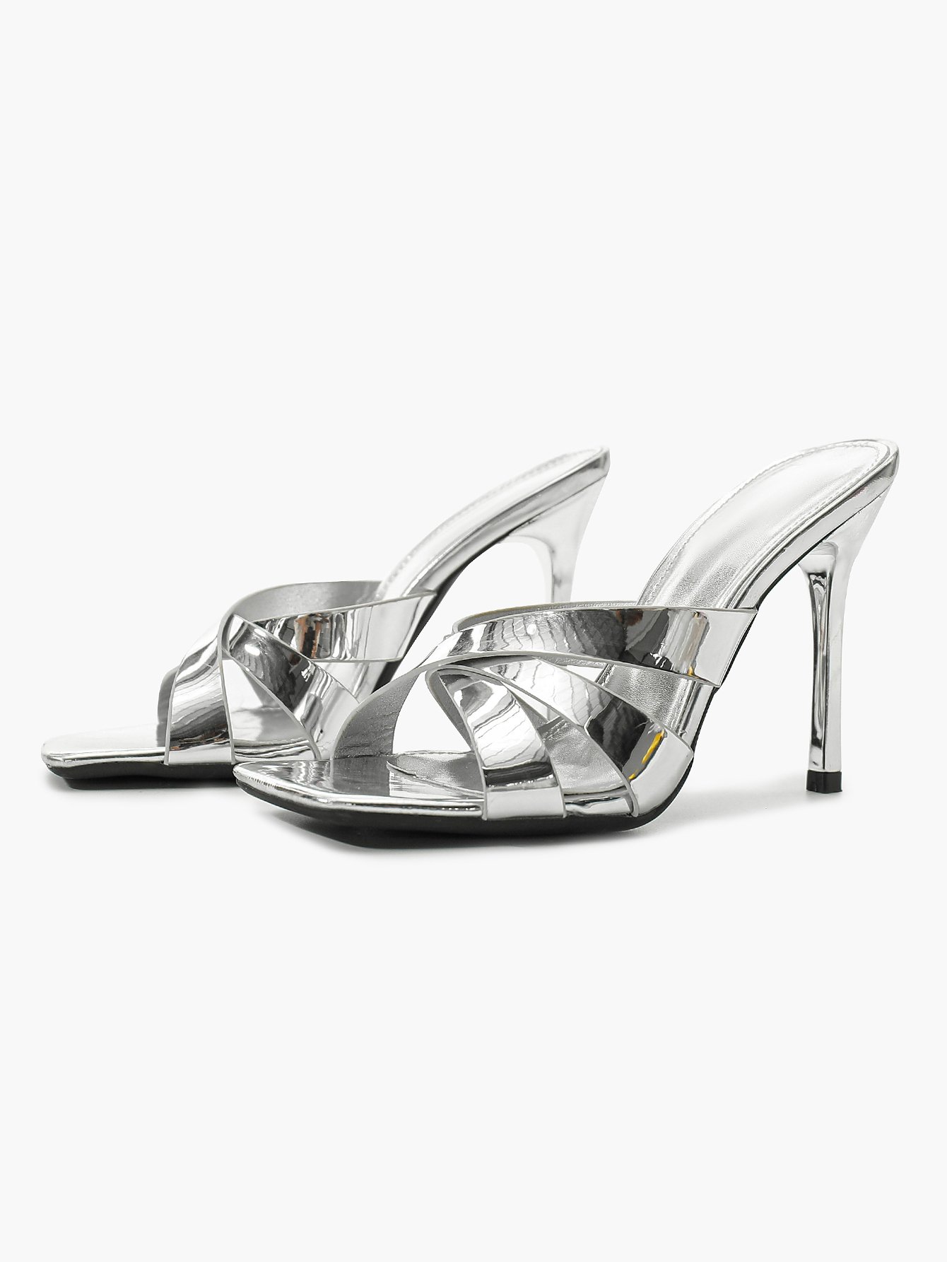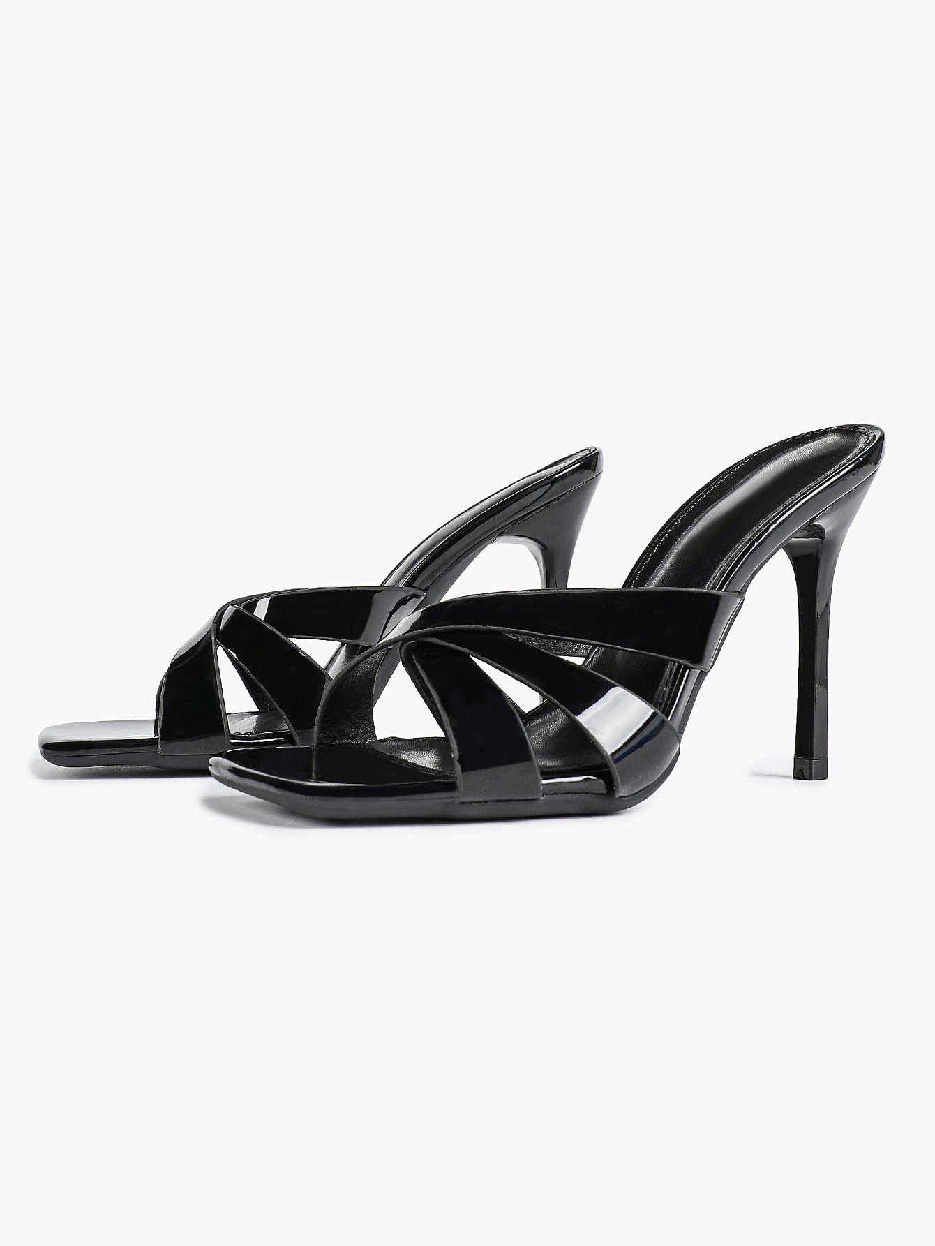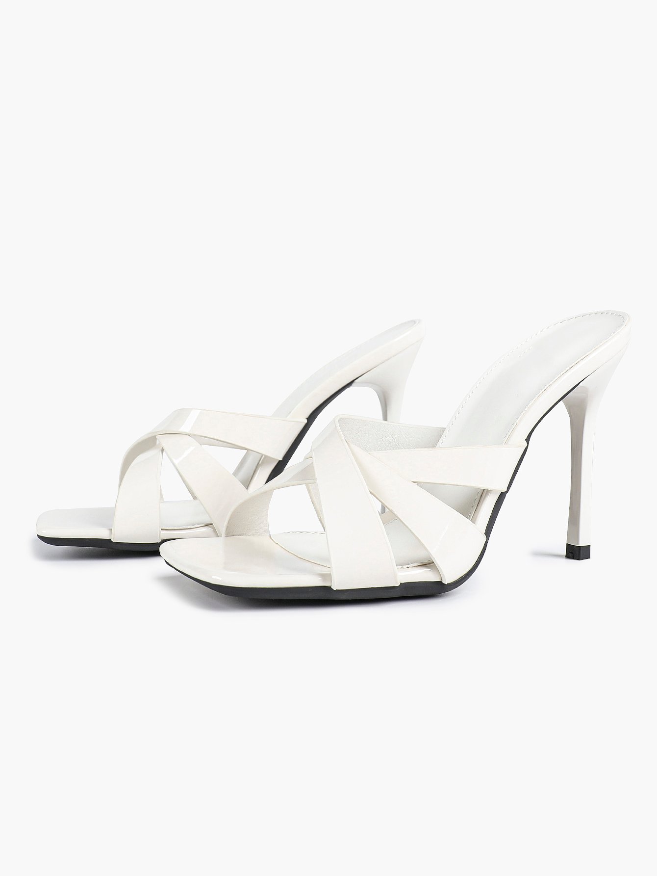 Modern high-heeled sandals with a square toe and crisscross strap design.