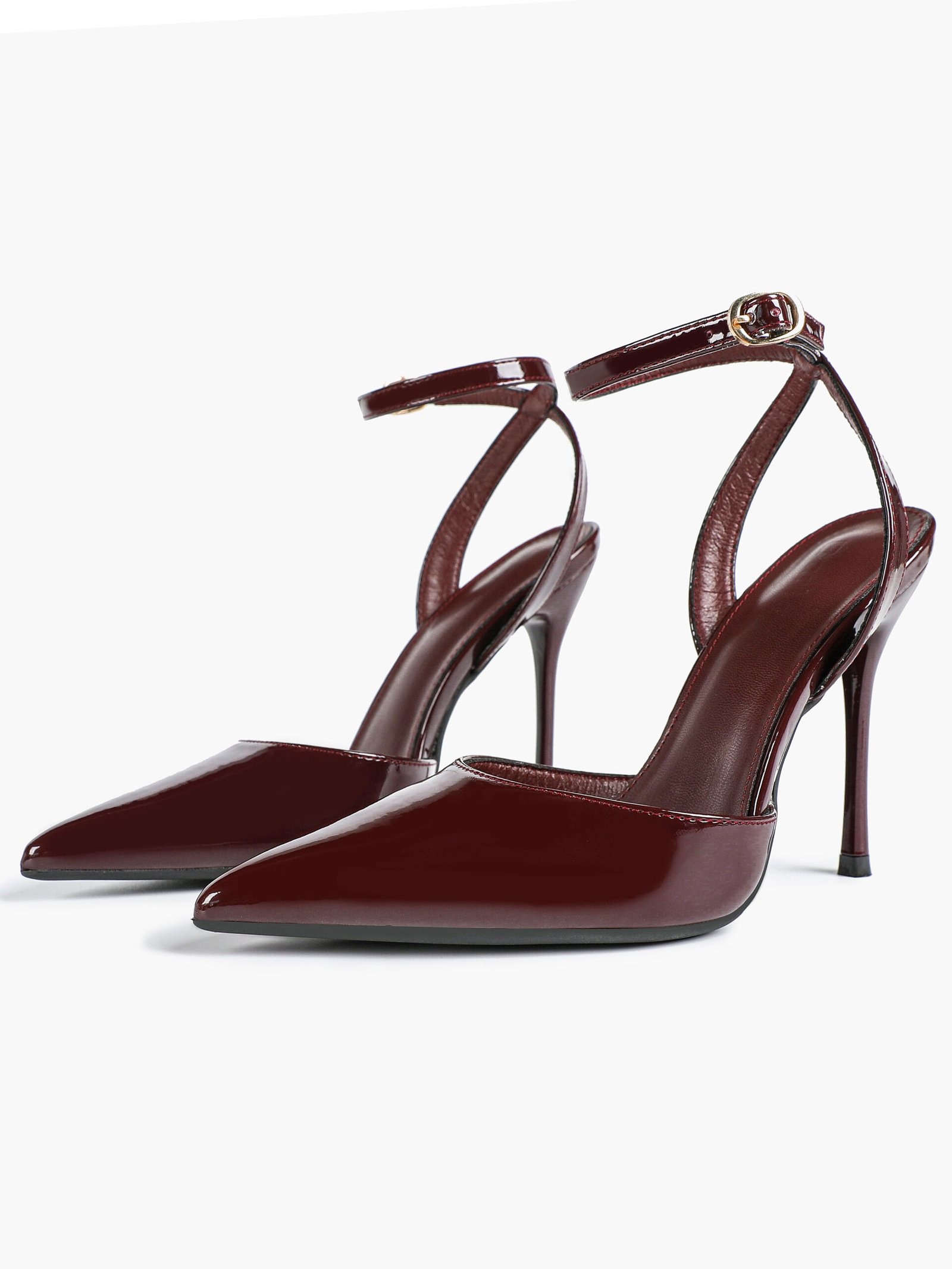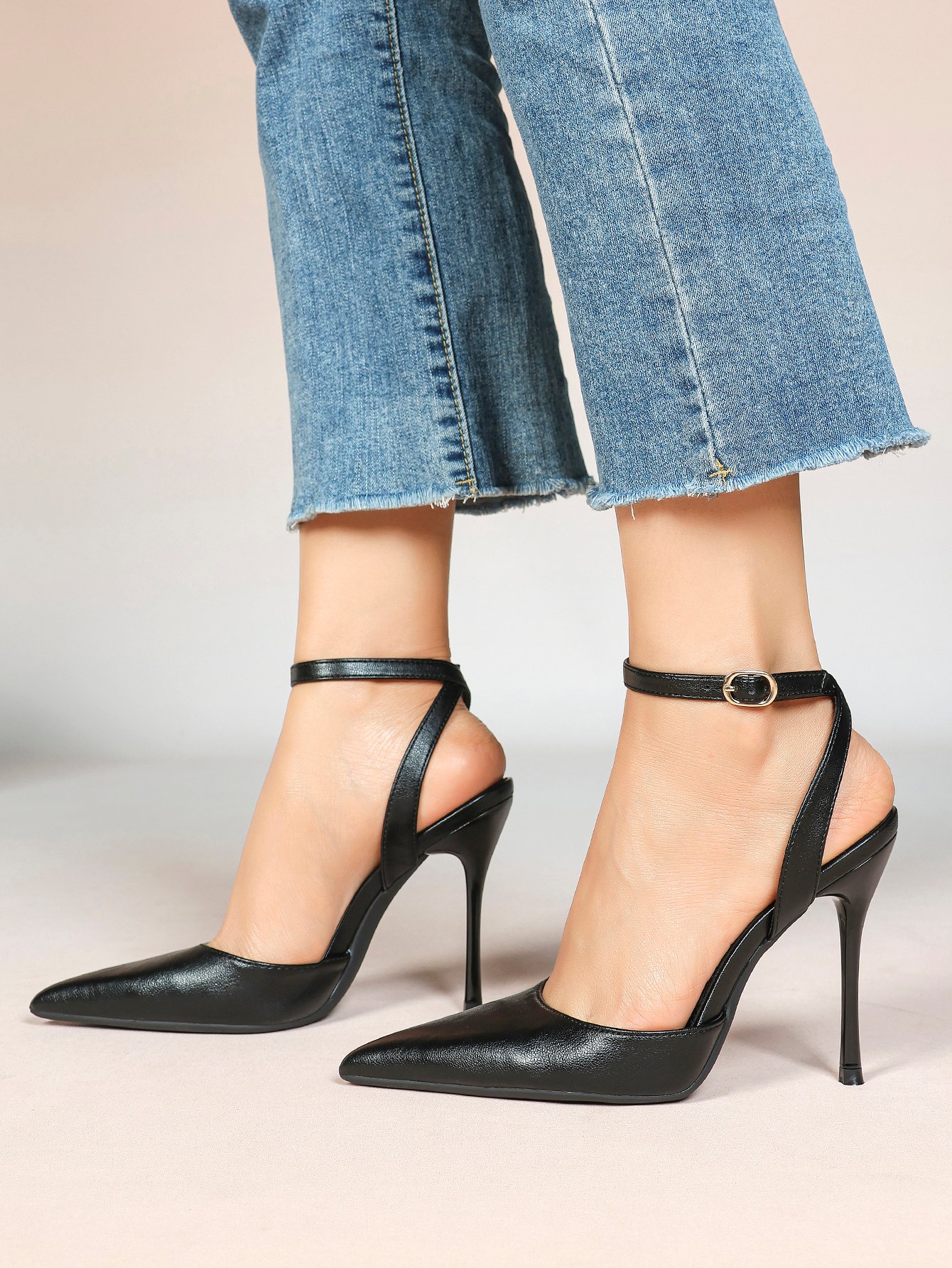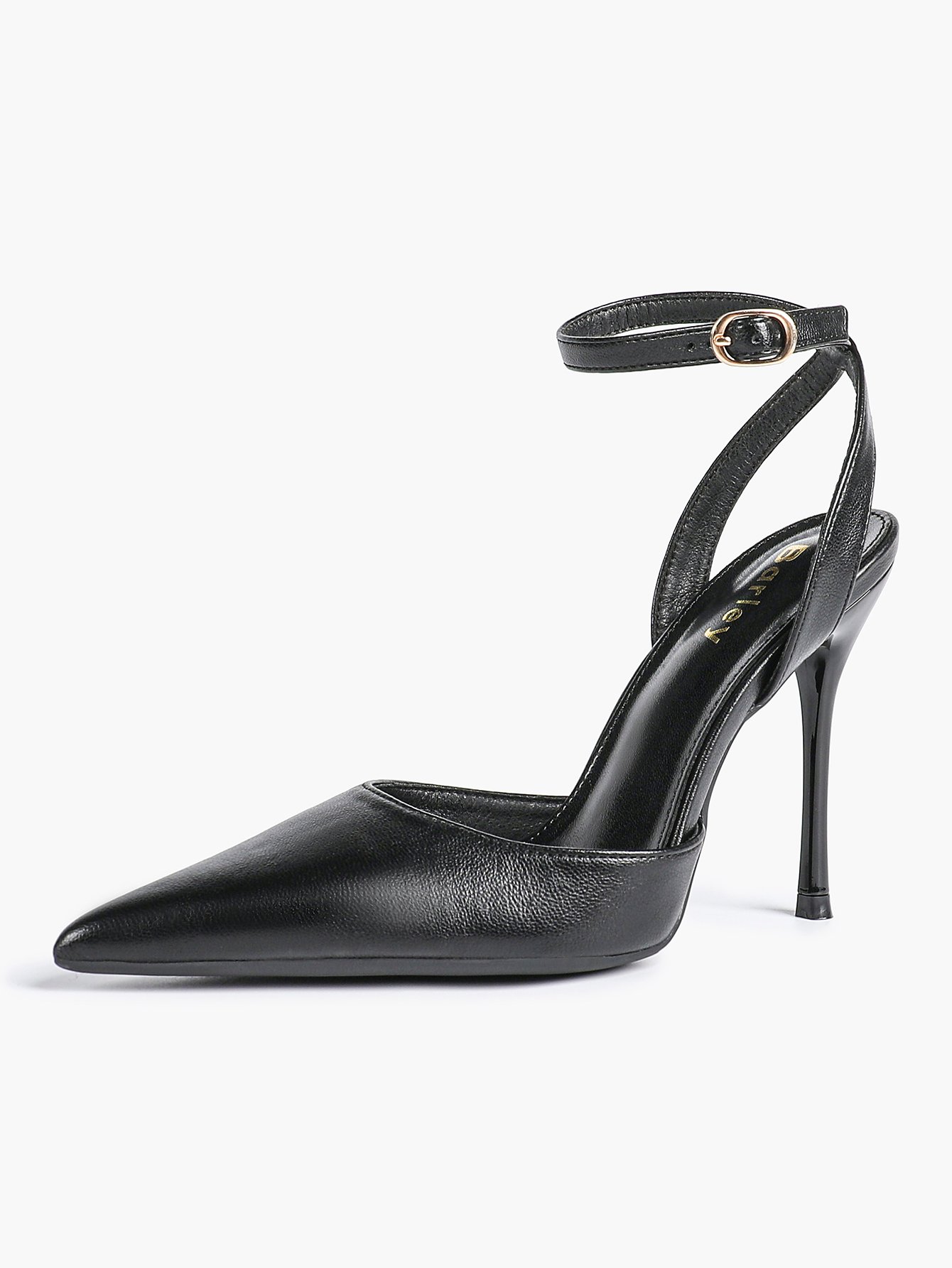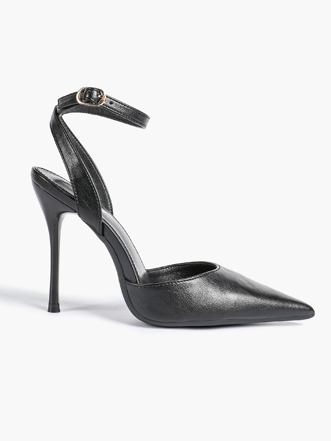 The adjustable ankle strap with a gold-tone buckle ensures a secure, personalized fit, while the sharp pointed toe elongates your legs for a flattering silhouette. The slender stiletto heel adds just the right amount of height, elevating your look without compromising on stability.