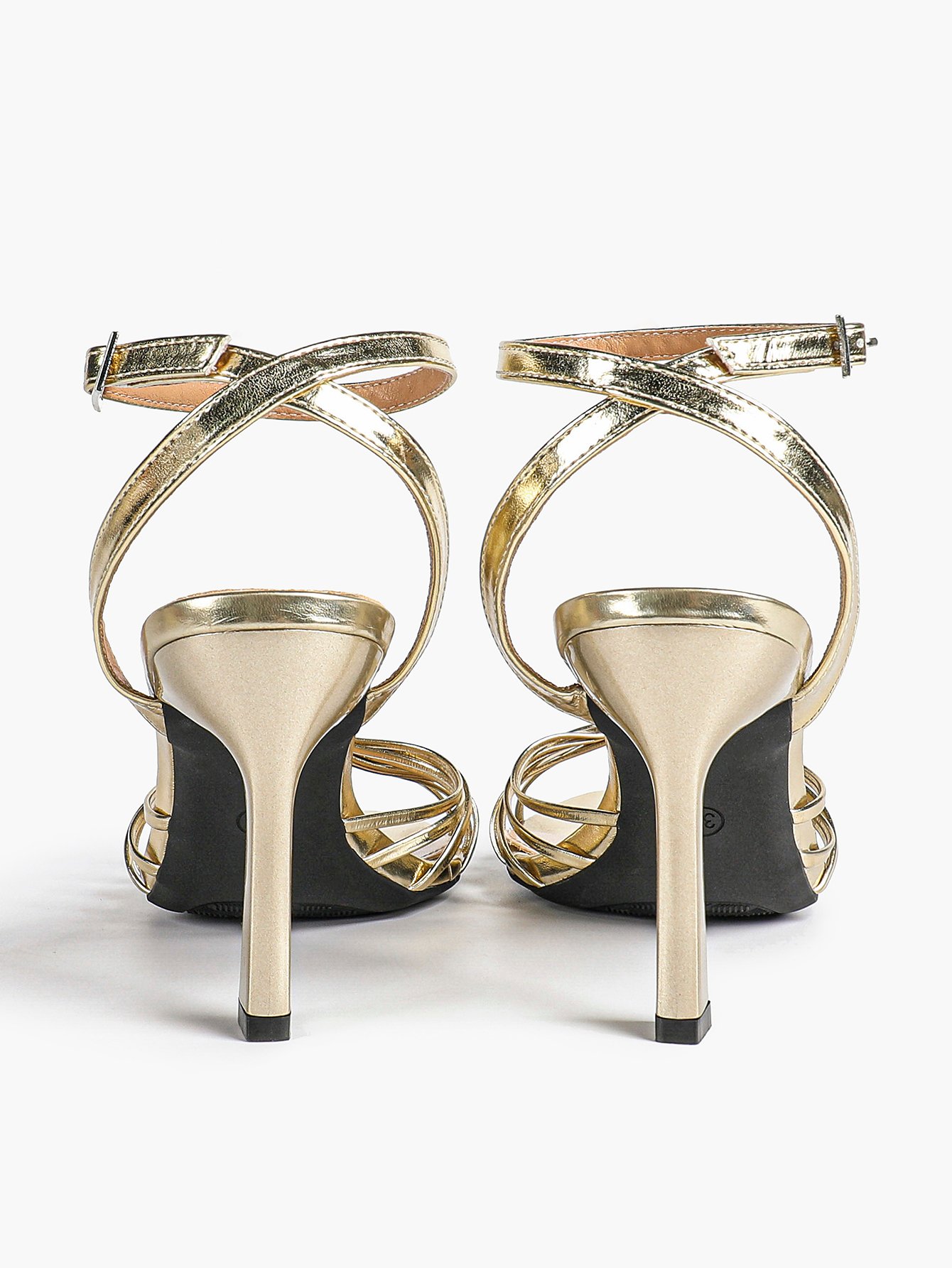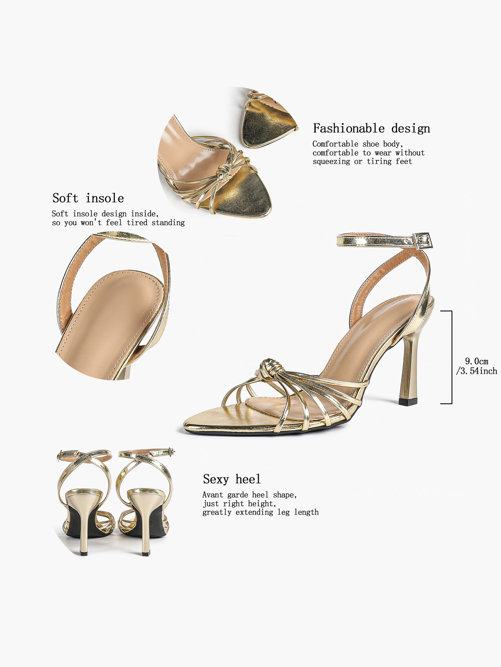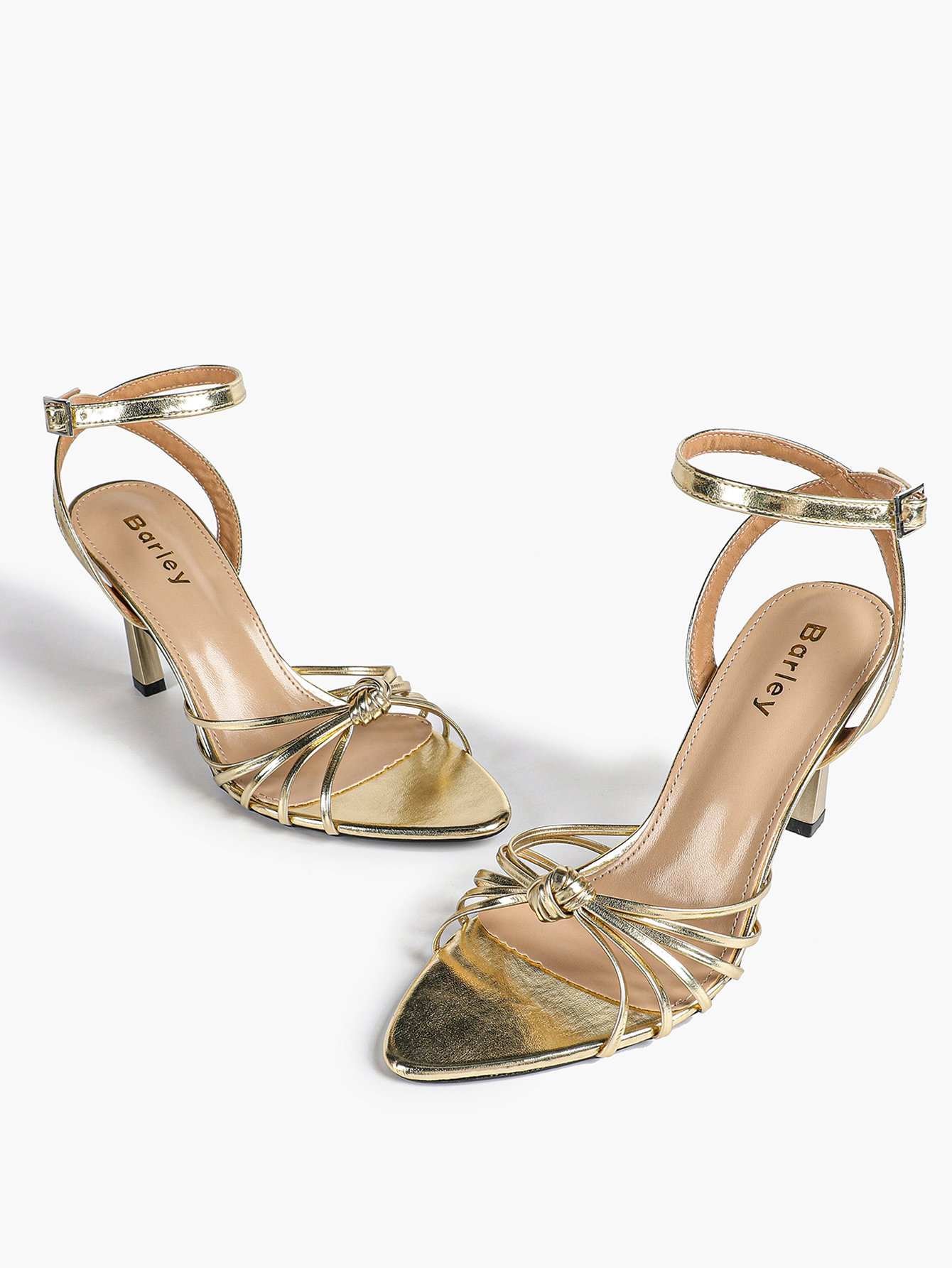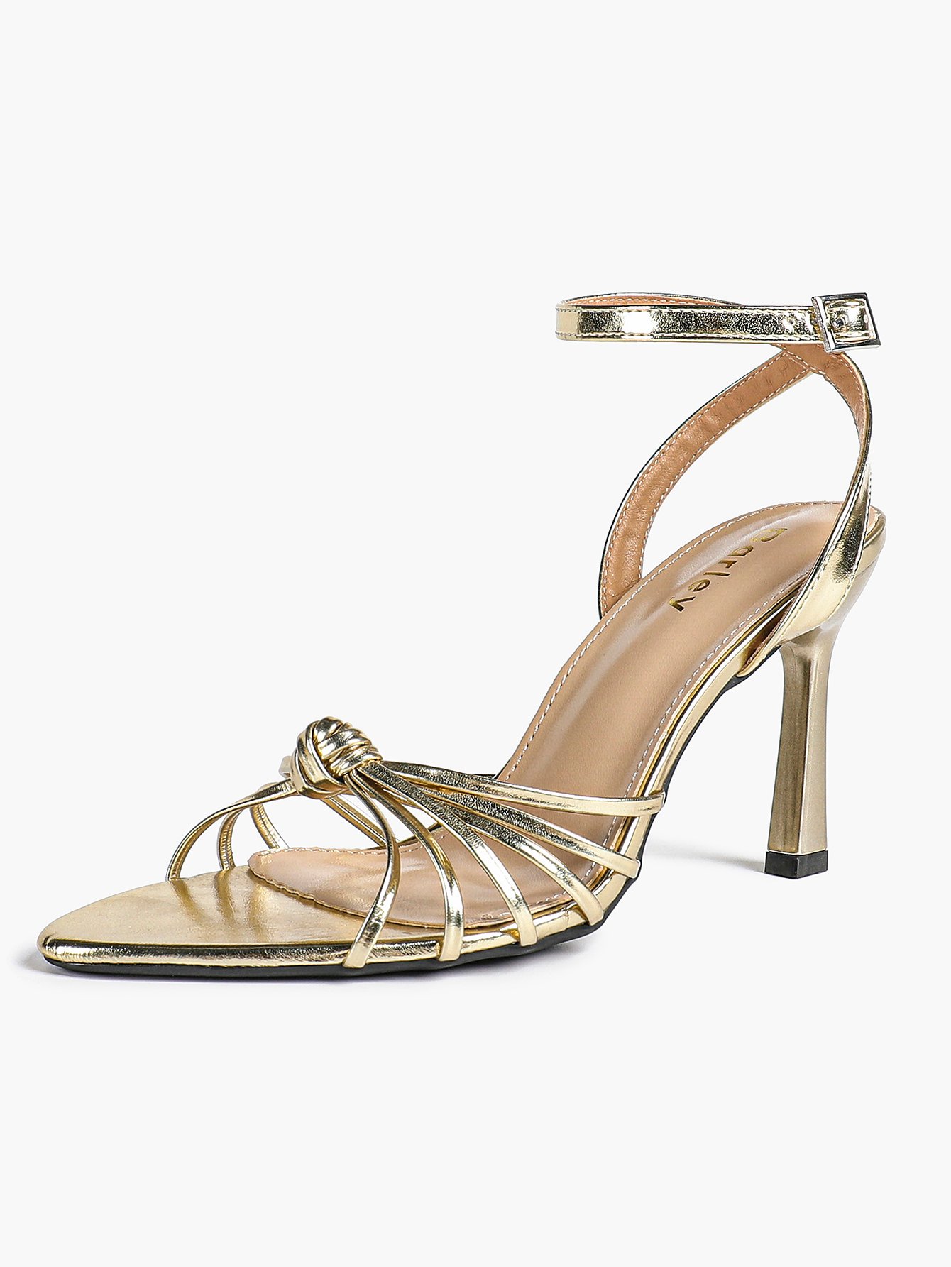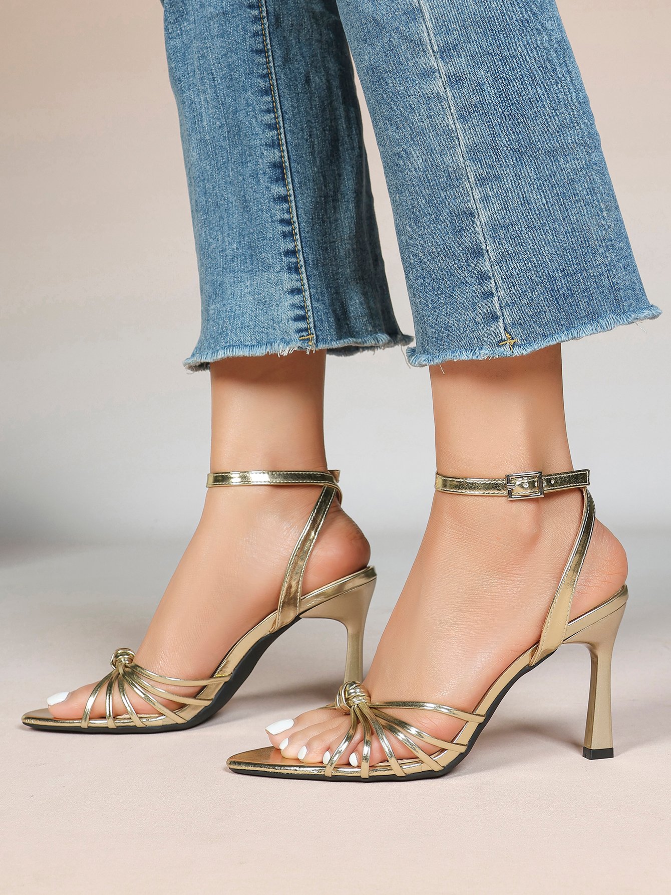 The adjustable ankle strap ensures a secure fit, while the knotted multi straps create a flattering silhouette. The slender stiletto heel adds elegant height, balancing style and stability.