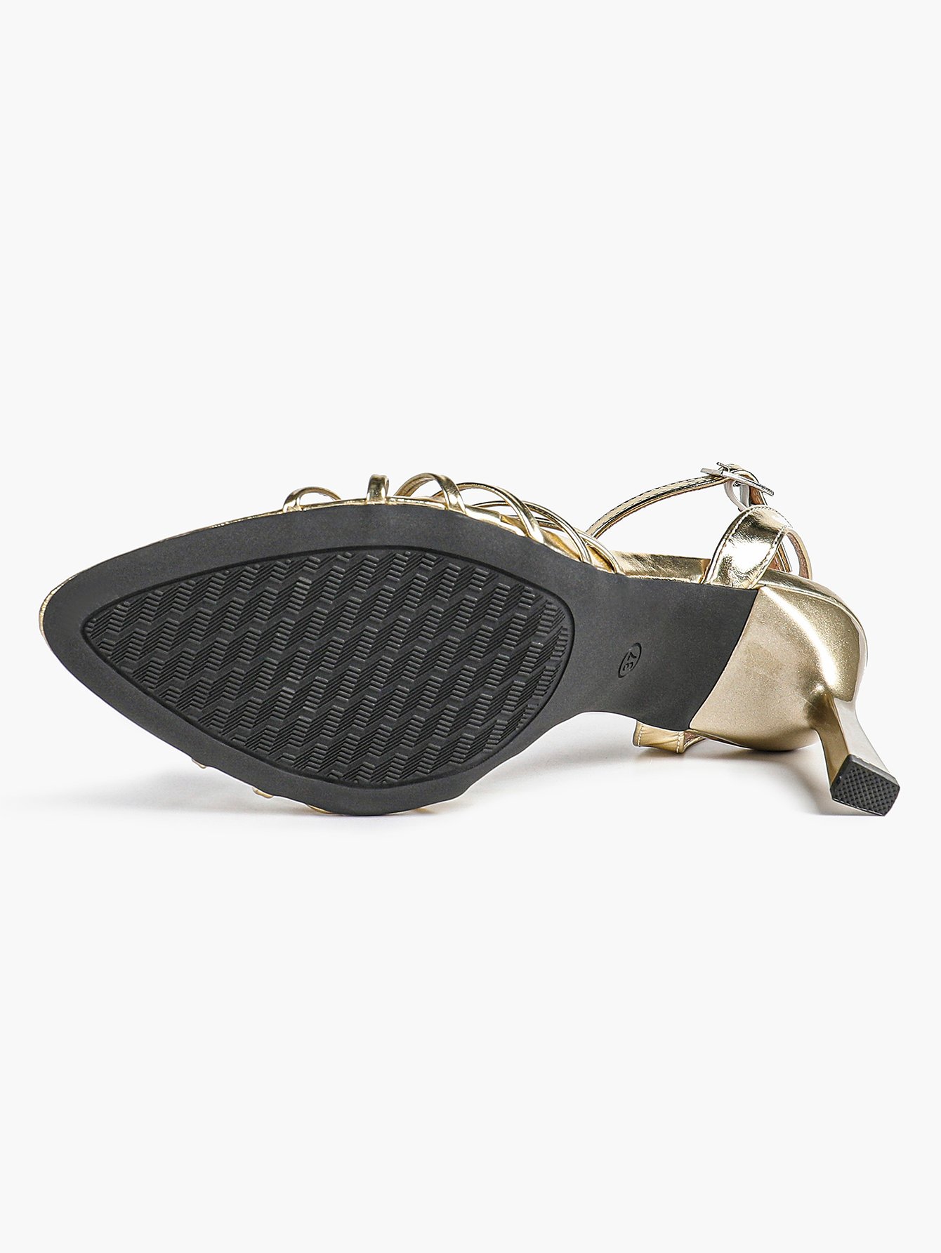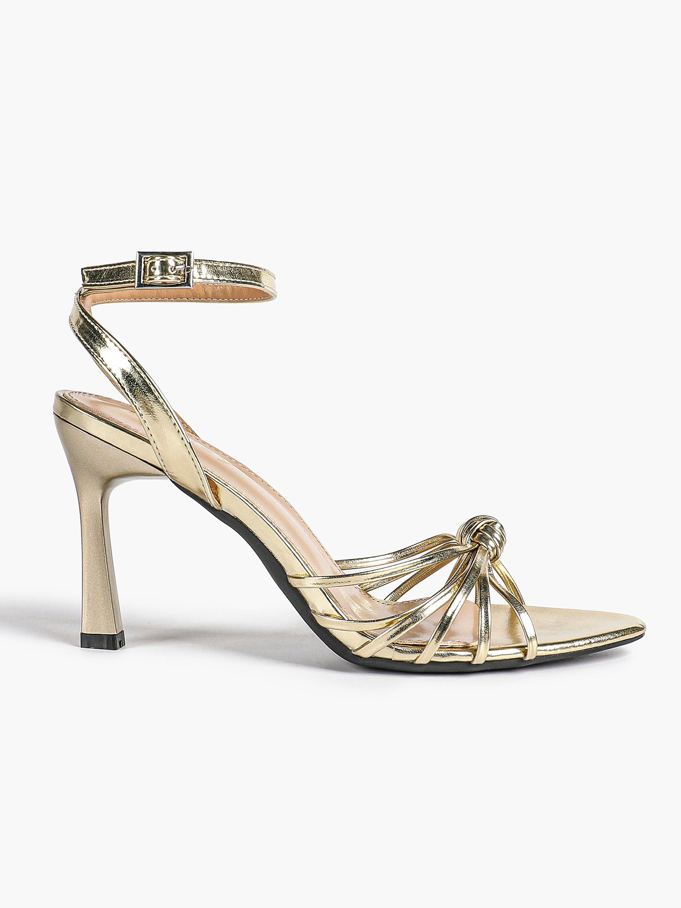 Elevate your look with our Women’s Metallic Knotted Strap Square Toe Stiletto Sandals.