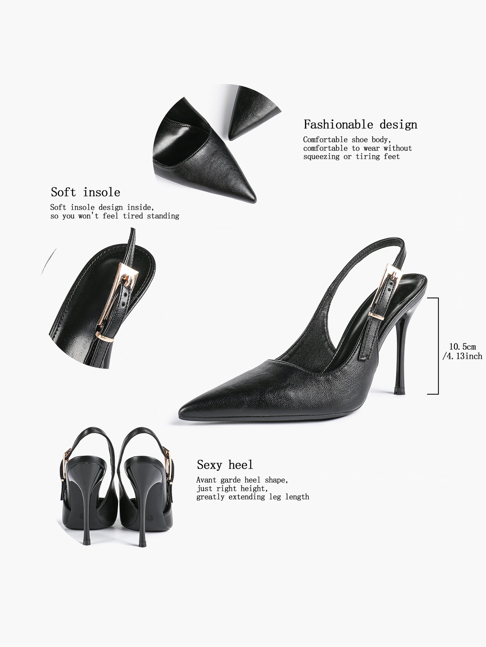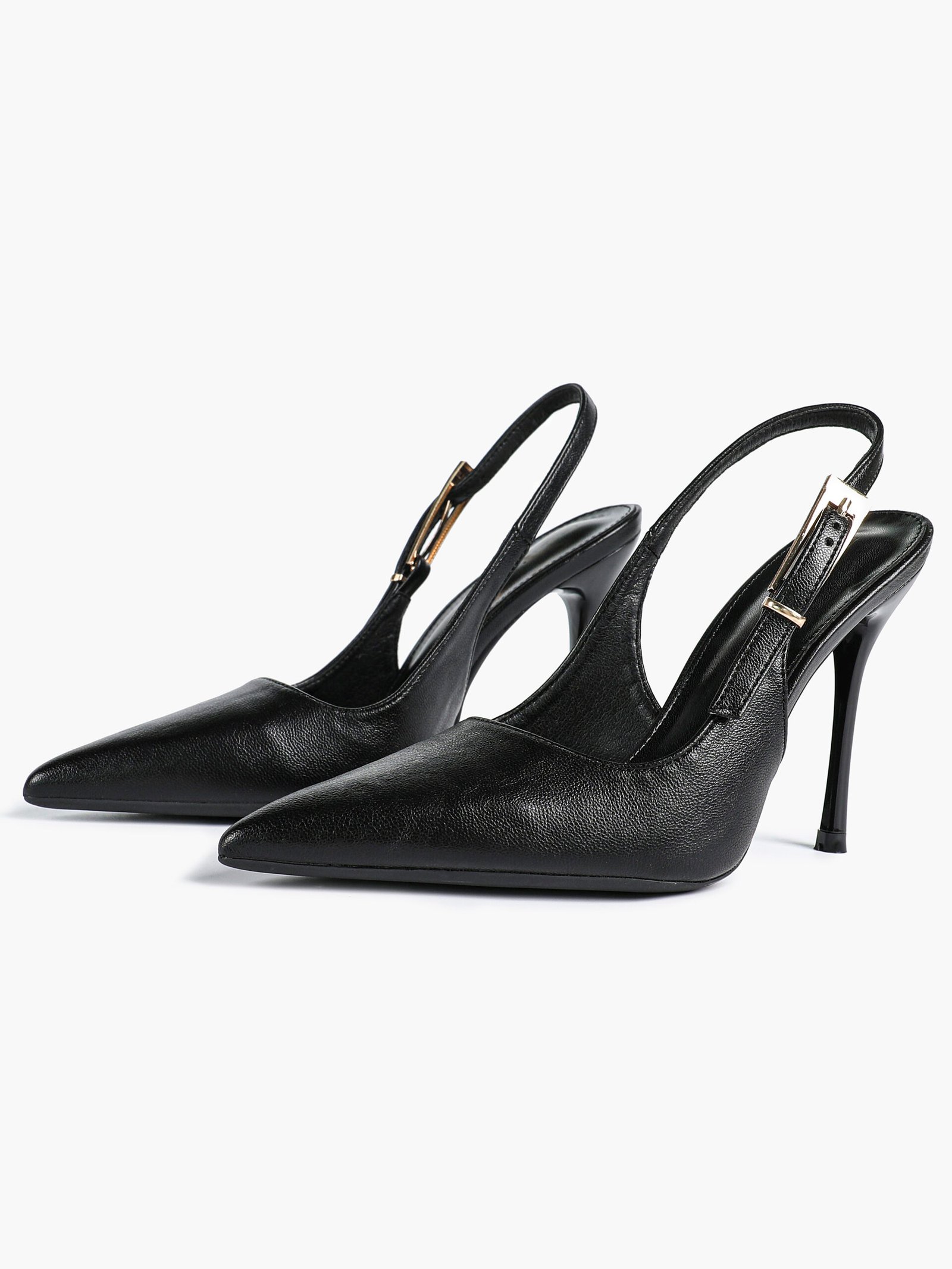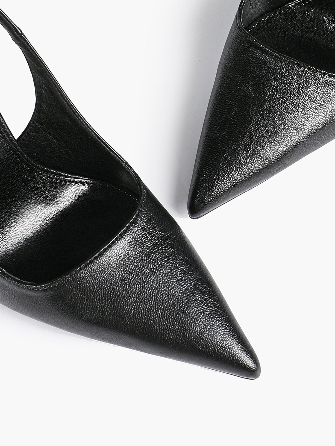 The pointed toe creates a sleek, elongated silhouette, while the adjustable slingback strap ensures a secure, comfortable fit throughout the day.